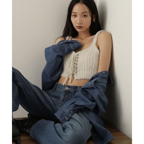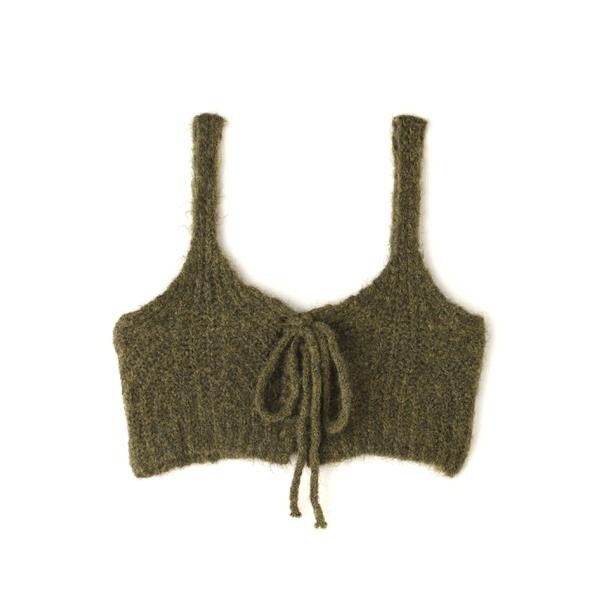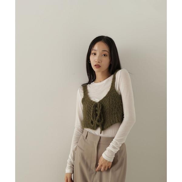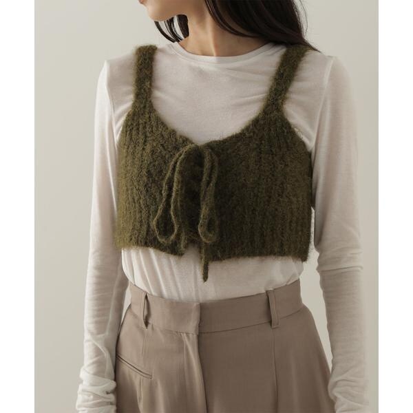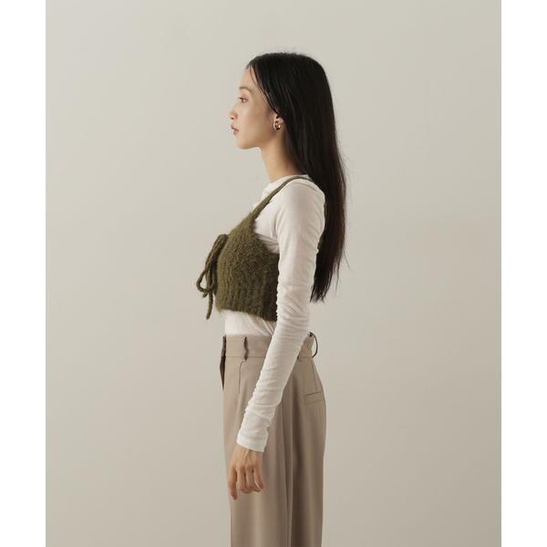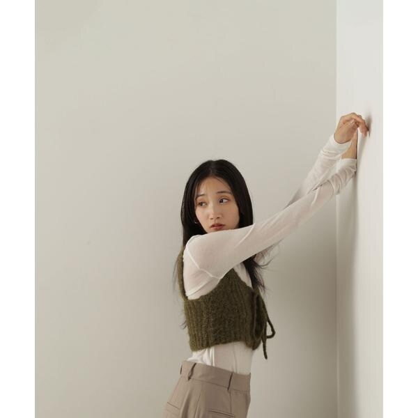 暑い時期からインナーを変えて楽しめるニットビスチェ。コンパクトなサイズ感なので、シャツやカットソーと合わせるとこなれ感の出るスタイルを演出。フロントのレースアップはあえて長めに垂らすことで甘過ぎずに洒落見えするデザインです。ざっくりと編むことカジュアルなアイテムとも相性が良く、ジャケットなどハンサムなアイテムを上に羽織るスタイリングもオススメです。<素材>リサイクルポリエステル混を使用したサスティナブルな糸を使用。ふわっとした風合いで多色見えな素材です。<詳細>仕様・開閉なし裏地・なし透け感・あり / 光沢・なし / 伸縮性・あり 生地の厚さ・普通※モデルの着用画像の場合、光の当たり具合により、実際の色味と異なって見えることがございます。色味は、商品単体の画像をご参照ください。