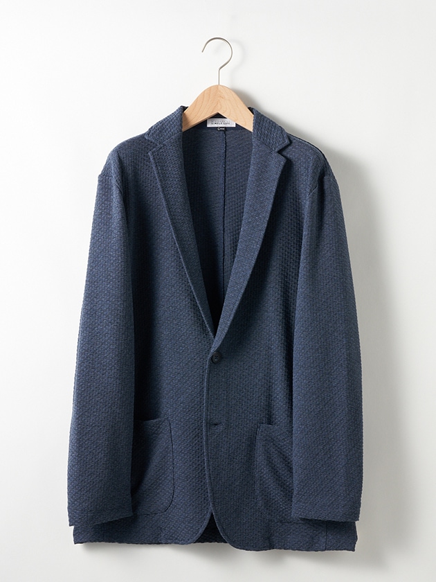 通気性の良い変形鹿の子を採用し、カーディガン感覚で羽織れるカジュアルなジャケットです。撚り杢糸を使用し、独特なMIXカラーを表現しています。少し肌寒いときや、夏場でもしっかりとした恰好をしたい時などに使える便利なアイテムです。