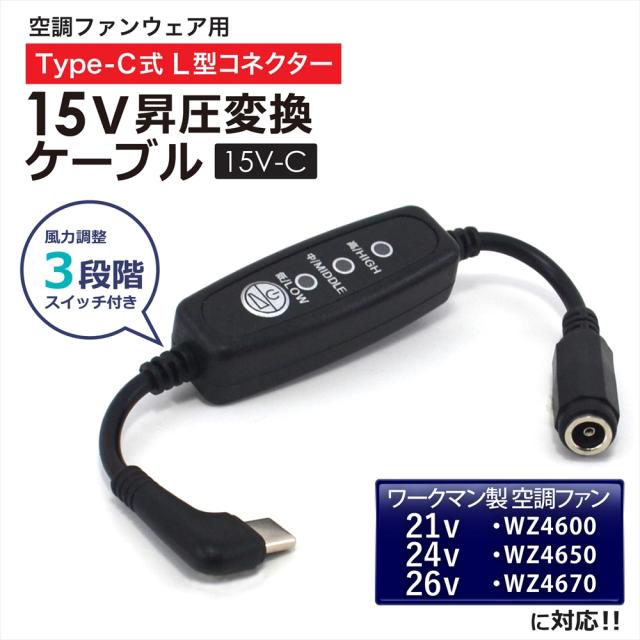 15V Type-C昇圧 アダプター 21V 24V 26V ワークマン対応 ウィンドコア WZ4600 WZ4650 2024年 WZ4670 2025年 WindCore L型 空調ウェア ファン付き作業服 Type-C PD対応 モバイルバッテリー 変換 電圧不足 USB-C端子 昇圧ケーブル 昇圧コンバータスイッチ付き 【15V-C】