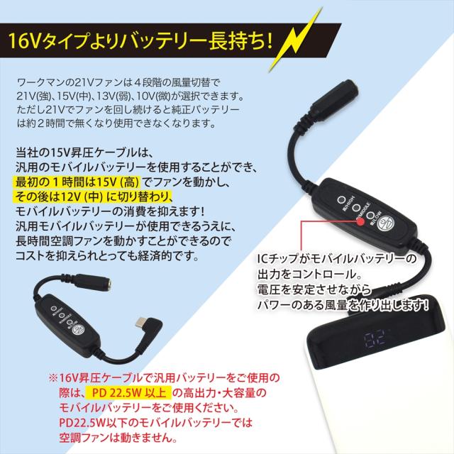 | 商品説明 | ◇16Vタイプよりバッテリー長持ち!◇ 最初の1時間は15V!その後は12Vに切り替わるのでバッテリーの消費を抑えられます! ・PD対応のモバイルバッテリーの出力を15Vに昇圧することができるType-C昇圧アダプターです。 ・このアダプタにより、モバイルバッテリーをファン付き作業服のバッテリーとして使用できるようになります。 ・Type-C端子は断線に強いL型コネクタ。 ・胸元のケーブルのもたつきも軽減します。 ・風量を3段階で調節できるスイッチが付いており、気温や体調に合わせて簡単に風量が調節できます。 |