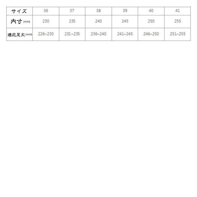 | サイズについての説明 | (36)23.0cm (37)23.5cm (38)24.0cm (39)24.5cm (40)25.0cm (41)25.5cm ヒール約3cm |