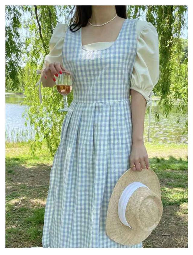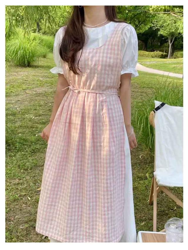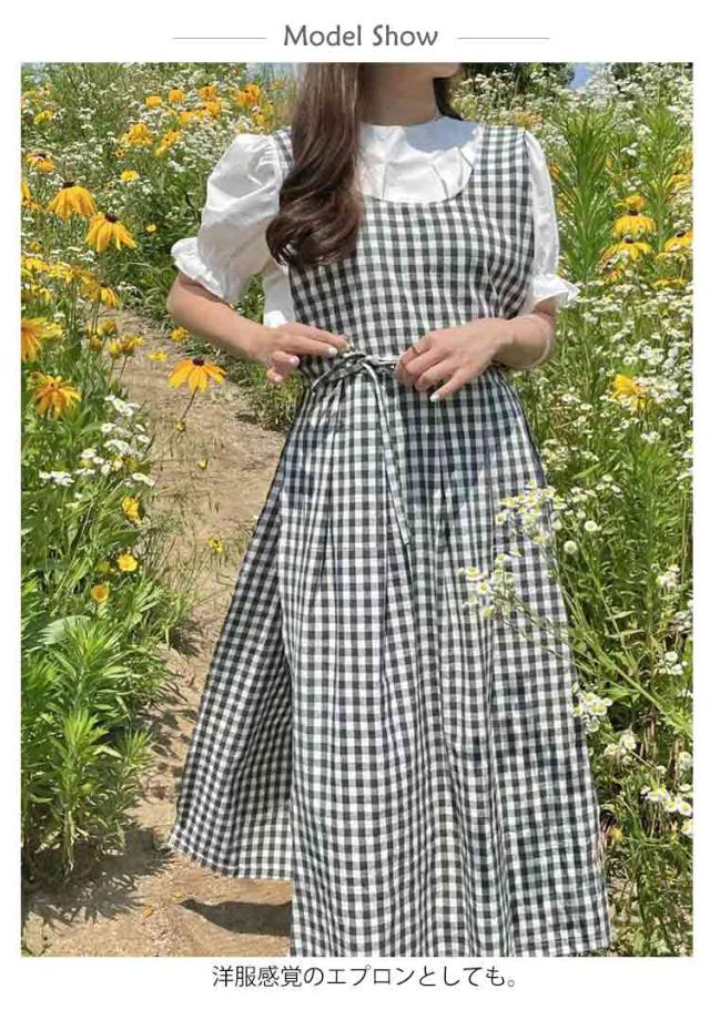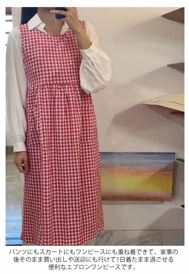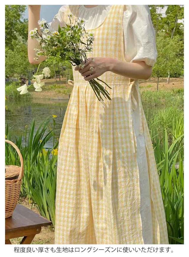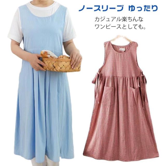 エプロンワンピース ワンピース ギンガムチェック ロングワンピース 無地 ノースリーブ ゆったり エプロンワンピース ワンピース エプロン 重ね着 可愛い 普段着 縦長視覚