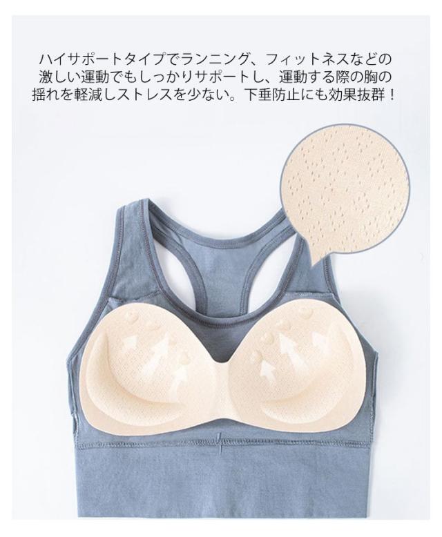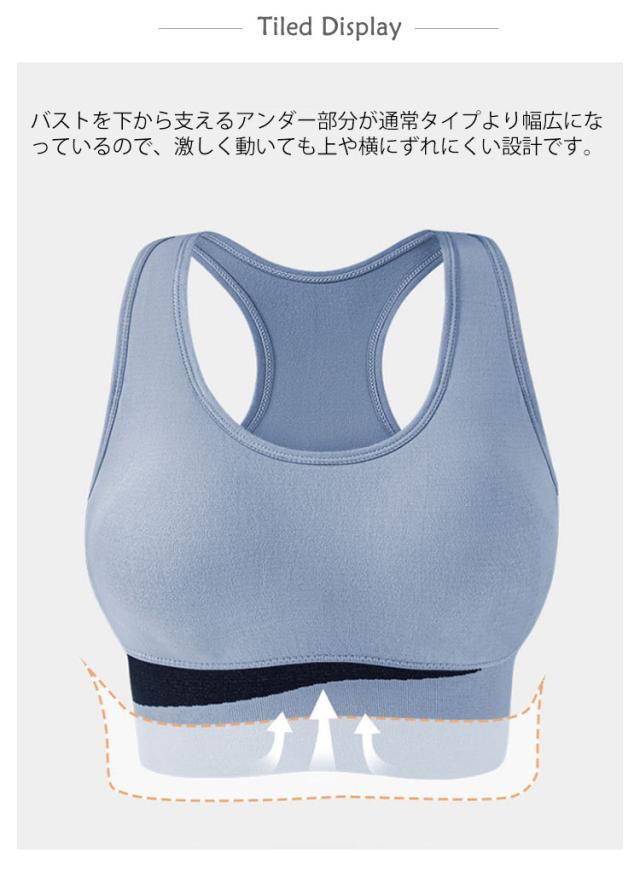 | かっこいい見えるスポーツブラ。 バストを下から支えるアンダー部分が通常タイプより幅広になっているので、激しく動いても上や横にずれにくい設計です。 圧迫感や窮屈感がなく、肌触りがよい、それに伸縮性に優れし、胸を締めつけないように着られます。 厚めの肩紐で長時間のランニング激しい運動でも肩が痛くなることを防ぎます。 ハイサポートタイプでランニング、フィットネスなどの激しい運動でもしっかりサポートし、運動する際の胸の揺れを軽減しストレスを少ない。下垂防止にも効果抜群! | |
