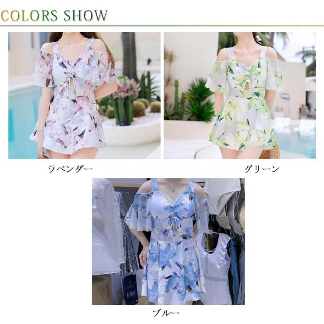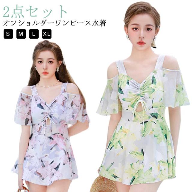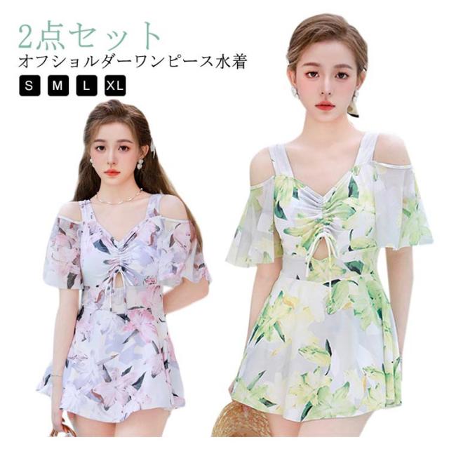 40代 水着 20代 オフショルダー フレア レディース 2点セット ショートパンツ 花柄 ワンピース ママ水着 露出控えめ ワンピース水着 30代 体型カバー