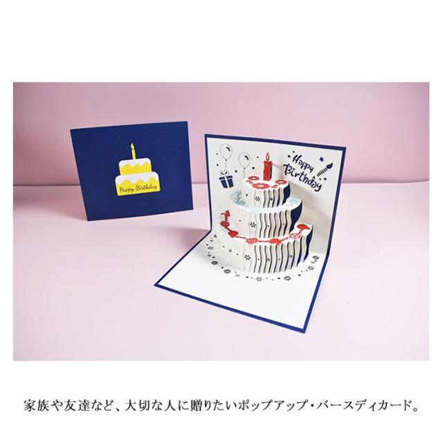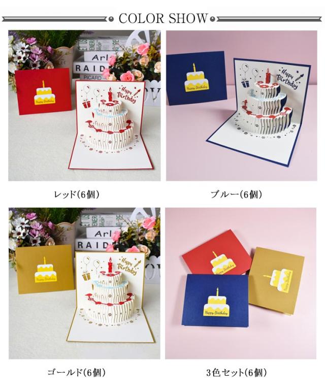 | 【お得な6枚セット】【バースデーカード】【全3色】 カードを開くと立体的なケーキが飛び出す、キュートなバースデーカード☆ 家族や友達など、大切な人に贈りたいポップアップ・バースディカード。 ケーキの手前にメッセージカードを入れられるスペースがあるので、 手書きのメッセージを加えて贈ることができます♪ 大切な方へのお誕生日のお祝いメッセージにどうぞ♪ | |