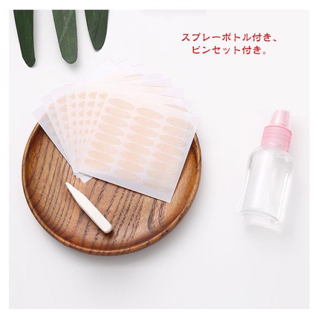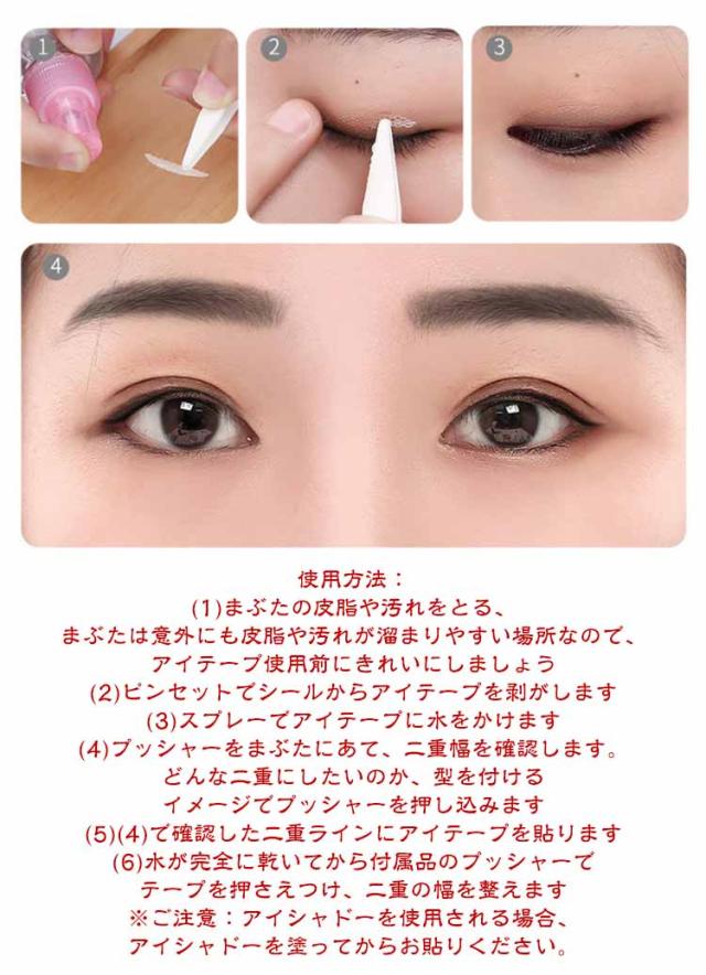 | 【624枚】【水で貼る】【4点セット】 お得な二重まぶたメッシュ式テープです。 簡単に水で貼り付け、のりは要りません。 スプレーボトル付き、ピンセット付き。 特殊のメッシュ素材、大切な肌にとても優しい、バレない 使用方法: (1)まぶたの皮脂や汚れをとる、まぶたは意外にも皮脂や汚れが溜まりやすい場所なので、アイテープ使用前にきれいにしましょう (2)ピンセットでシールからアイテープを剥がします (3)スプレーでアイテープに水をかけます (4)プッシャーをまぶたにあて、二重幅を確認します。どんな二重にしたいのか、型を付けるイメージでプッシャーを押し込みます (5)(4)で確認した二重ラインにアイテープを貼ります (6)水が完全に乾いてから付属品のプッシャーでテープを押さえつけ、二重の幅を整えます ※ご注意:アイシャドーを使用される場合、アイシャドーを塗ってからお貼りください。 | |