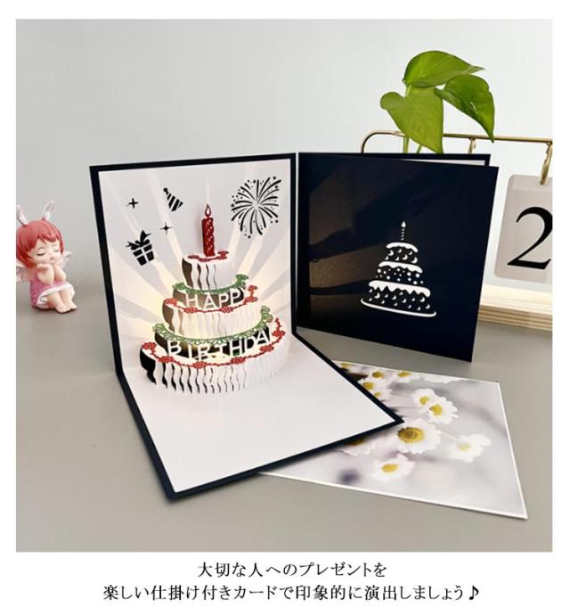 | 【2枚セット!誕生日カード】【光る・音楽付き】【全9種】 繊細なカッティングアートが飛び出す! 開いて楽しいポップアップ式のバースデーカードです。 インパクトのある多層のカッティングアートが美しく、思わず飾りたくなるような素敵なデザインです。 ケーキの手前にメッセージカードを入れられるスペースがあるので、 手書きのメッセージを加えて贈ることができます♪ 大切な人へのプレゼントを楽しい仕掛け付きカードで印象的に演出しましょう♪ | |