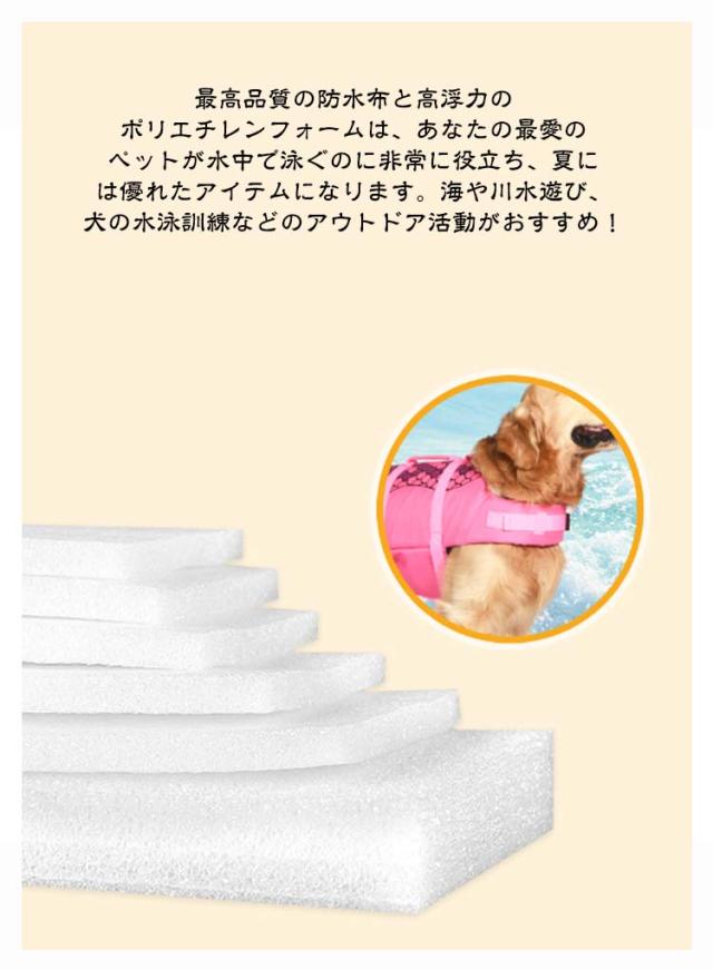 | 魚のような背びれを持つ犬用ライフジャケット。 【反射素材を使用】:バックラインは反射素材!鮮やかで目立つ色もあり、遠い所まで泳げでも見つかりやすいです。海や川での水遊びの事故を防ぐため犬 ライフジャケットです。 【泳ぐを補助して安全を守る】:内部はさらに厚めの浮力材料を充填しています。十分に補強する背中のハンドルは緊急な時に犬を水から引き上げることができます。また、愛犬を身に近くに保つためのリード用のDリングフックも追加されています。 【カチッと簡単装着】:ペットライフジャケットの首回りと胴回りはマジックテープとバックルを使って装着が簡単になります。愛犬が束?される感覚がないで、着脱に手間取らないカンタンさ、飼い主にもわんちゃんにも楽チン。 【 優れた素材】:最高品質の防水布と高浮力のポリエチレンフォームは、あなたの最愛のペットが水中で泳ぐのに非常に役立ち、夏には優れたアイテムになります。海や川水遊び、犬の水泳訓練などのアウトドア活動がおすすめ! | |