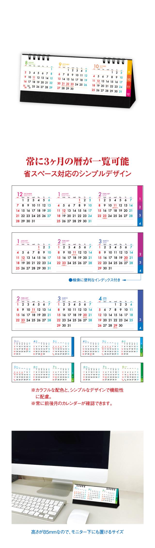 | 商品特徴 | ・卓上タイプのスリーマンスカレンダー ・高さが85mmなのでモニター下にも置けるサイズ ・常に3ヶ月の暦が一覧可能 ・省スペースのシンプルデザイン ・カラフルな配色とシンプルなデザインで機能性に配慮 |