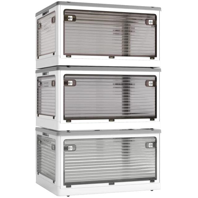【折り畳み?上に蓋/側面扉付き】収納箱界の大革新!使わない時に折りたたんで収納できます。スペースを取りません。側面四面も扉付き、収納にとても便利です。上にふた付き、物を入れやすい。蓋をロックできます。物を取るは側面扉から、ボックスを積み重ねる状態にも楽に物を取り出して、伝統的な収納ボックスに比べてもっと便利で、機能性が向上します。