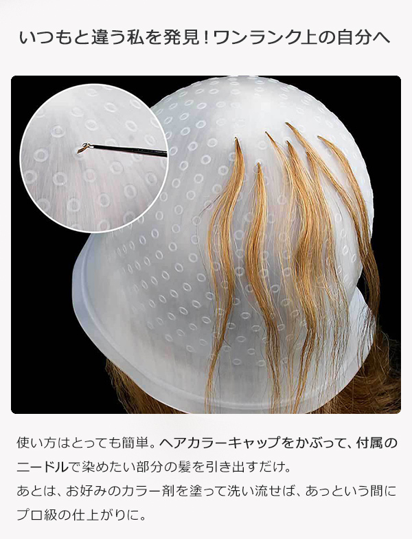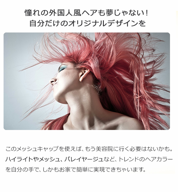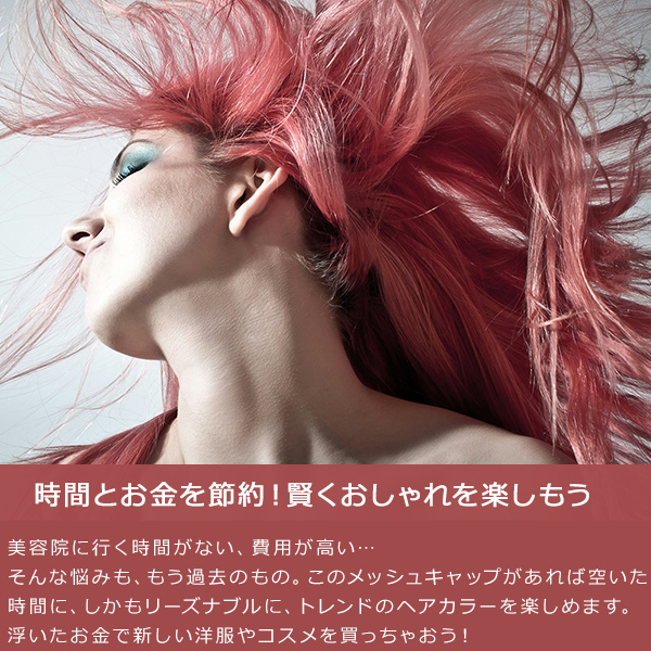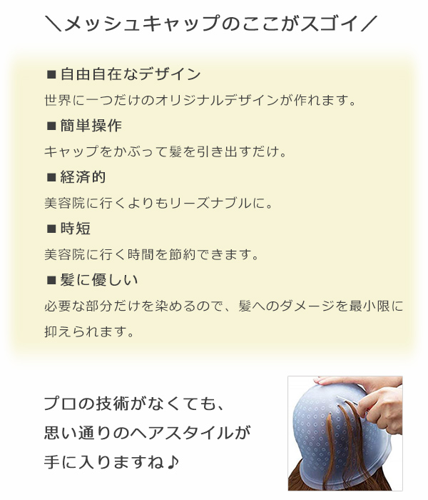■自由自在なデザイン: メッシュの位置や太さを自分で決められるので、世界に一つだけのオリジナルデザインが作れます。 ■簡単操作: キャップをかぶって髪を引き出すだけなので、セルフカラー初心者でも安心。 ■経済的: 美容院に行くよりもリーズナブルに、トレンドのヘアカラーを楽しめます。 ■時短: 美容院に行く時間を節約できます。 ■髪に優しい: 必要な部分だけを染めるので、髪へのダメージを最小限に抑えられます。