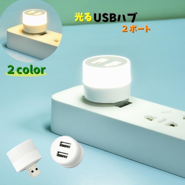 光るUSBハブ USBポート 単品 ライト付き 2ポート 増設 USBライト 白昼色 電球色 ミニサイズ 持ち運び 旅行 ケーブ