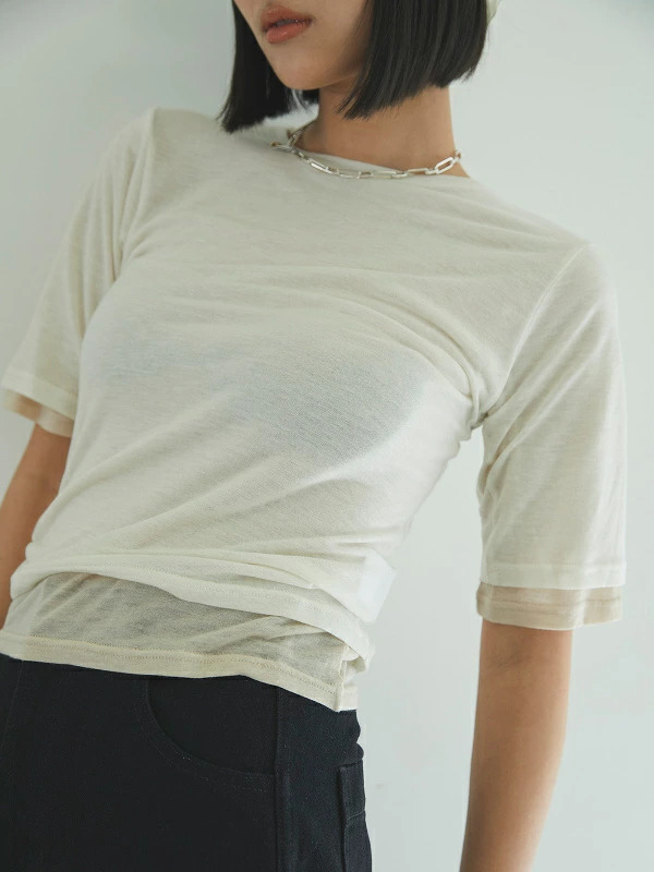 透け感のあるシアーTはお手持ちのインナーやニットビスチェ、カップインキャミソールなどと合わせていただくとコーディネートが完成します。