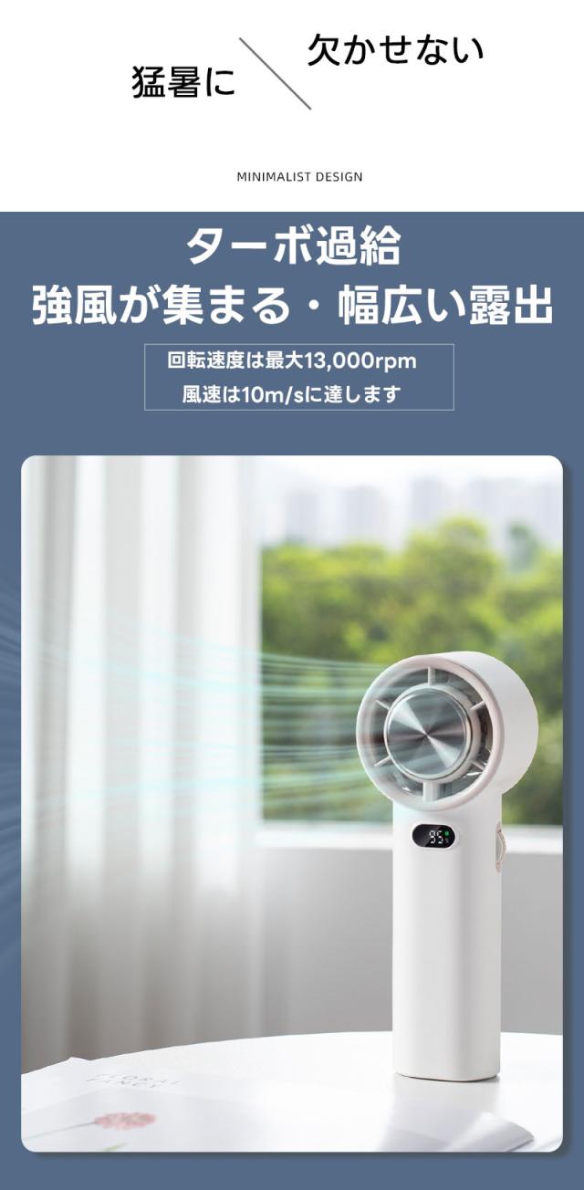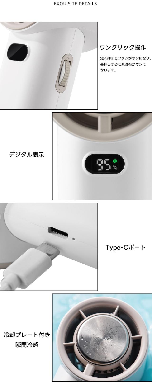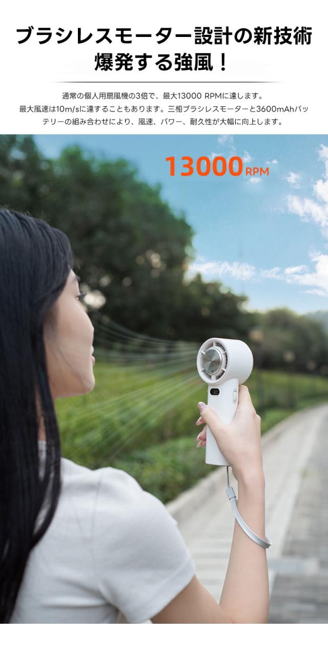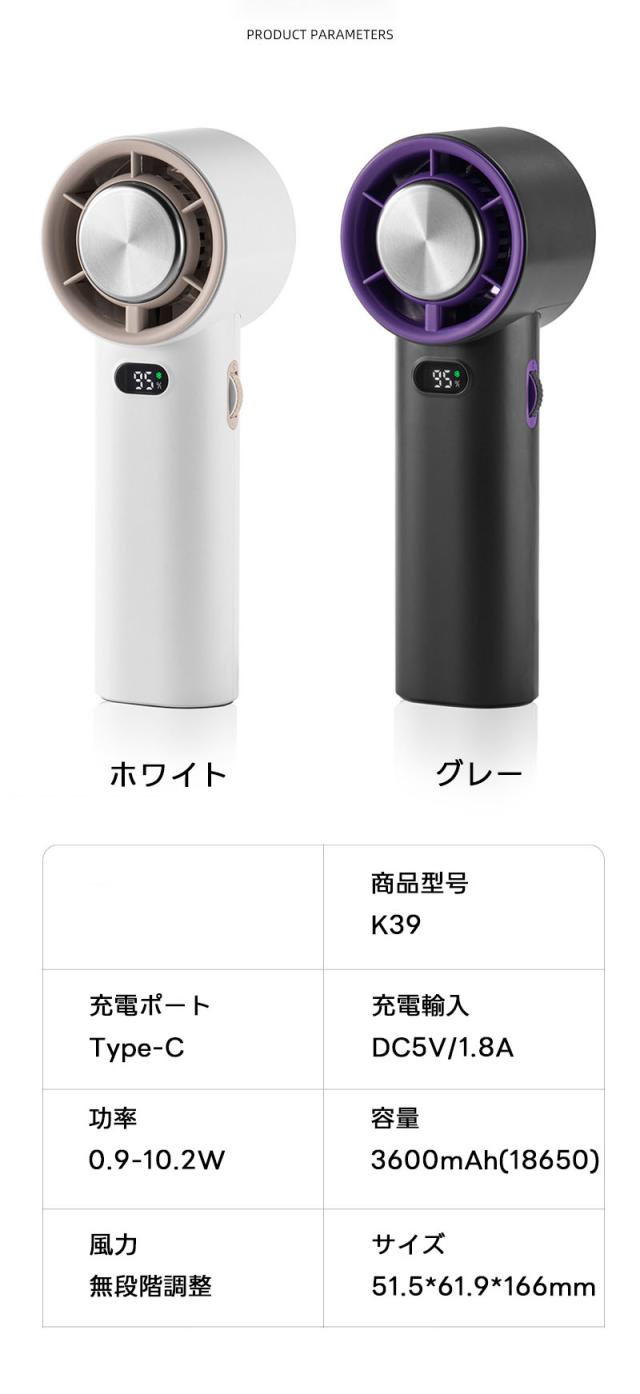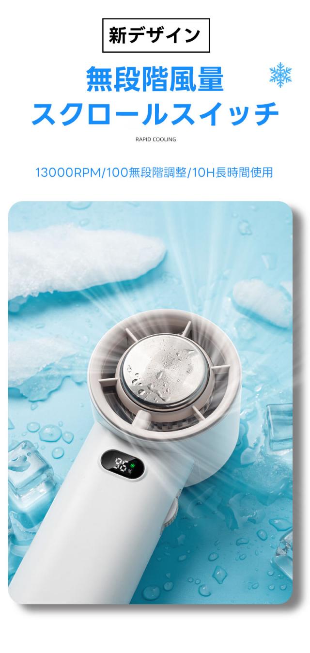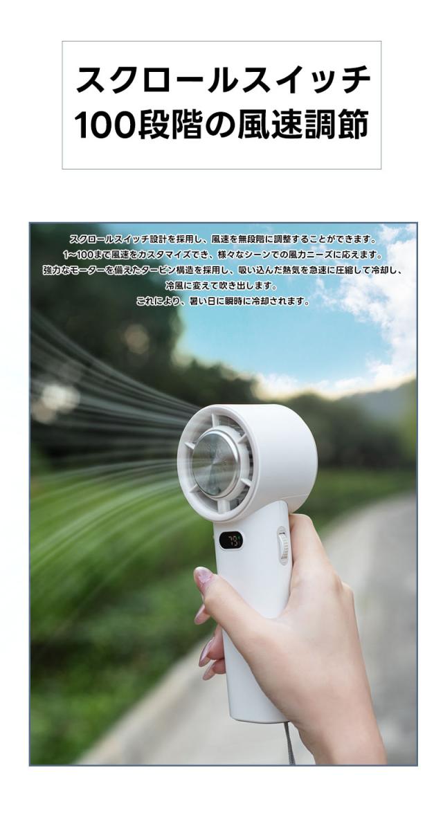 素材 ABS/電子部品 仕様 充電ポート:Type-C 充電輸入:DC5V/1.8A 功率:0.9-10.2W 容量:3600mAh(18650) 風力:無段階調整 サイズ:51.5*61.9*166mm 商品説明 ★【新登場瞬間冷却・先端半導体技術】 この携帯扇風機しいトレンドを導く半導体冷却交換技術を採用し、接触瞬間超冷感、体感温度が11-18℃下がります。冷却部を頬に当ててください、快適な冷感を瞬間感じます。今年の猛暑に欠かせないアイテムです。 ★【3600mAh大容量バッテリー内蔵&3段階風量調節】 ハンディ扇風機に大容量3600mAhのバッテリーを内蔵しており、およそ4時間でフル充電可能となっております。最大10時間の長持ちバッテリーで、頻繁的に充電の手間を減少して、外出中でも電源切れことを心配入れません。 ★【スクロールスイッチ・無段階100段階】 この小型扇風機はスクロールスイッチ設計を採用し、風速を無段階に調整することができます。1〜100まで風速をカスタマイズでき、様々なシーンでの風力ニーズに応えます。強力なモーターを備えたタービン構造を採用し、吸い込んだ熱気を急速に圧縮して冷却し、冷風に変えて吹き出します。 これにより、暑い季節にすぐに体を冷やすことができます。