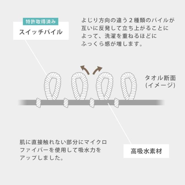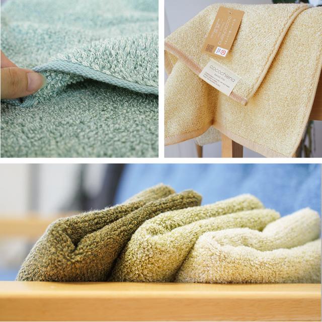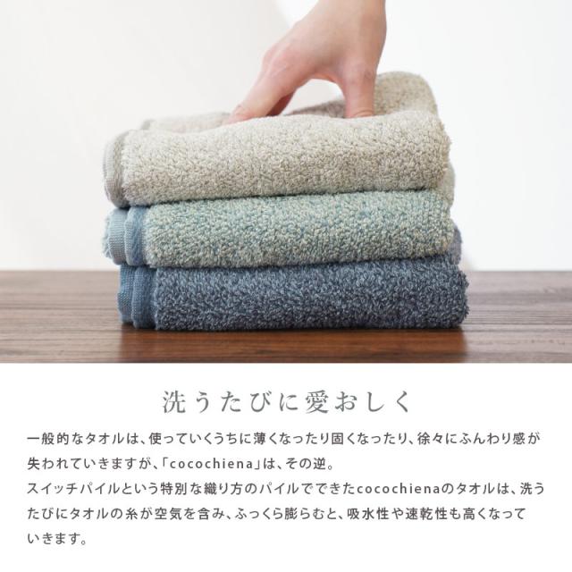 | ・洗うたびに愛おしく 一般的なタオルは、使っていくうちに薄くなったり固くなったり、徐々にふんわり感が失われていきますが、「cocochiena」は、その逆。特許取得済みの『スイッチパイル』という特別な織り方のパイルでできたcocochienaのタオルは、洗うたびにタオルの糸が空気を含み、ふっくら膨らむと、吸水性や速乾性も高くなっていきます。 ・パイルに抱かれる至福ぎっしり詰まったパイルは、脱色や毛羽落ちが少なく、風合いが長持ち、そしてしっかりと水分を吸収してくれます。吸水機能を兼ね備えつつ、直接肌にふれるものだからやっぱり天然のやさしさのコットン100%を。パイルがぷっくり立って、肌を押し返すようなソフトな弾力にうっとり。今までにない感触のタオルが完成しました。 ・タオルのお洗濯のコツ!基本的にタオルのお洗濯には柔軟剤のご使用はおすすめしません。柔軟剤を使用することで糸をコーティングしてしまい、吸水性が下がることやパイルが抜けやすくなる原因につながることがあります。お洗濯の際は洗濯ネットをご利用の上、たっぷりの水を使い、余裕ある量で洗っていただくとタオルがよりふっくらします。 ・糸が飛び出してしまったら・・・パイルの糸引きや糸切れを見つけたら、その箇所の糸をハサミでやさしくカットしてください。カットしても解ける心配はありません。 | |
