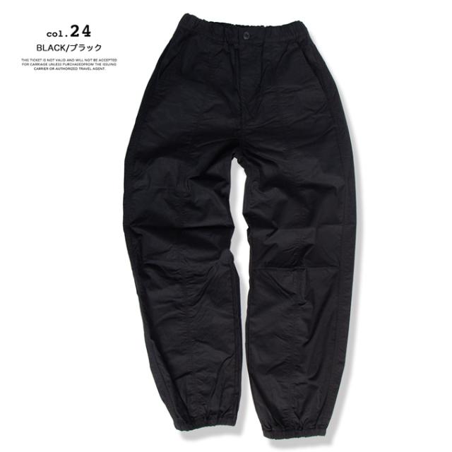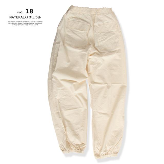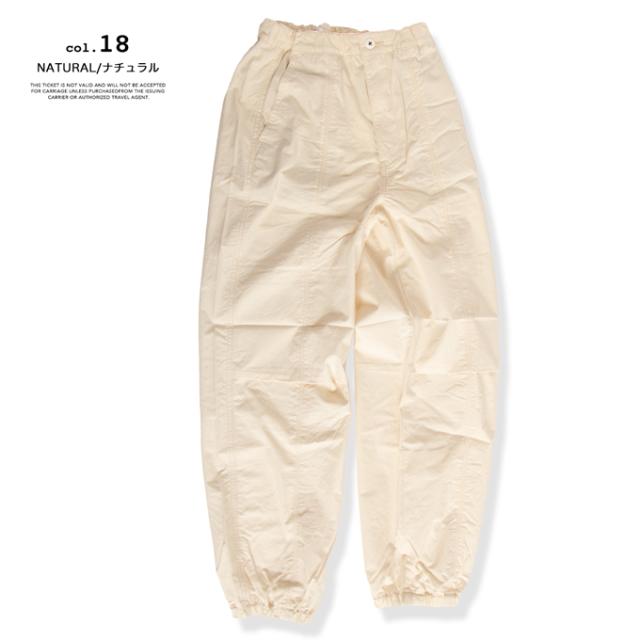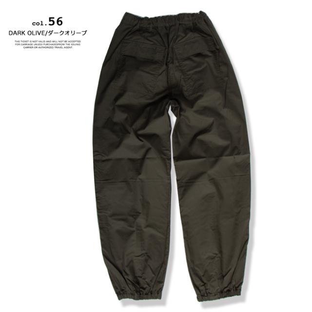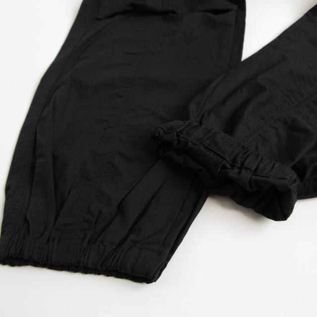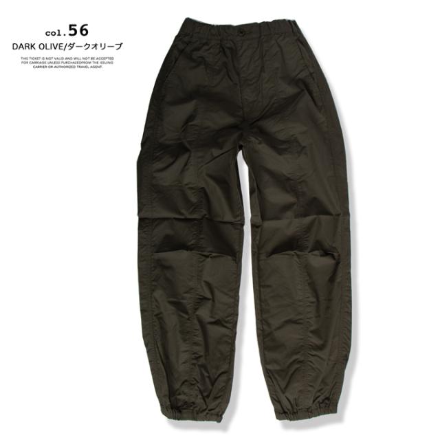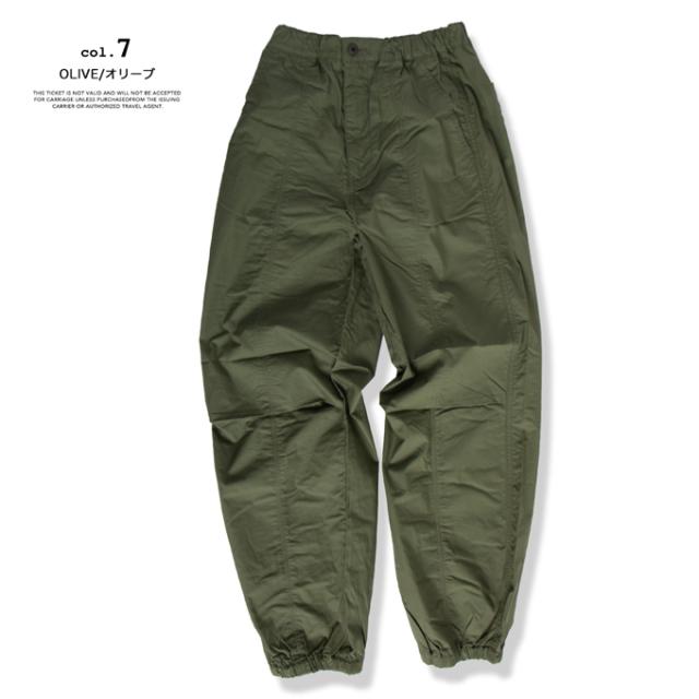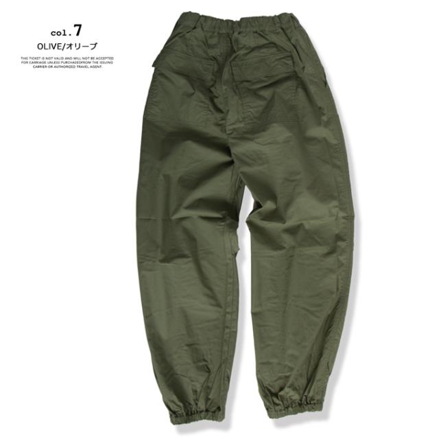 ヒザ部分にはタックが入り立体的なアクセントをプラスするとともに、よりカジュアルなテイストを引き立てます。ウエスト・裾ともにゴム仕様になっておりリラックス感もあるタウンユースなミリタリーパンツです。