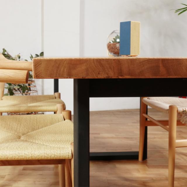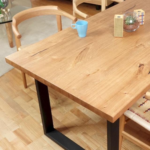 インダストリアルデザインのスチール脚部と木天板を組み合わせたスタイリッシュなテーブルです。オーク材の豊かな表情の木目にアクセントとなるパテのラインが特長で、異種素材を使用した製品らしくどんなチェアでも合わせやすいです。