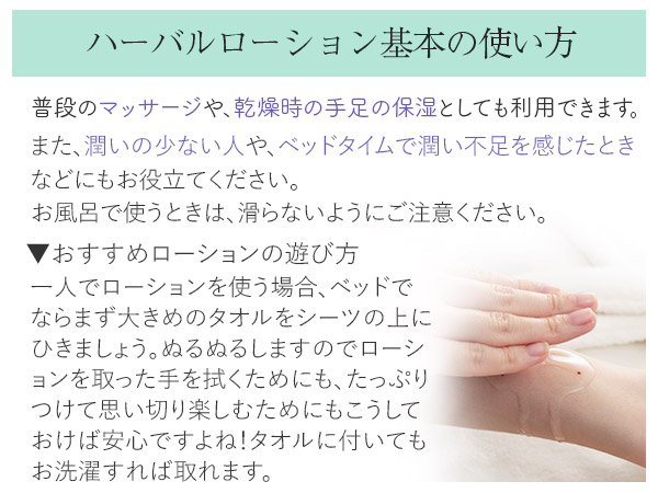 潤い不足が気になるときの潤滑ローション以外に、全身のボディマッサージローション、乾燥時の手足の保湿としてもご利用いただけます。