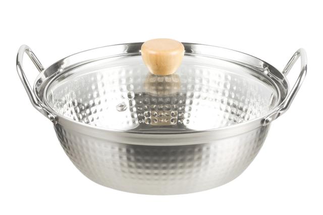 槌目模様が美しい、ステンレス製の卓上鍋です。寄せ鍋やしゃぶしゃぶなど寒い季節にみんなでお鍋を囲んだり、煮物やカレーなどの煮込み料理、茹でる・蒸すなど、普段の調理にも活躍します。軽くて丈夫な本体は扱いやすく、お手入れも簡単なので毎日気軽に使えます。