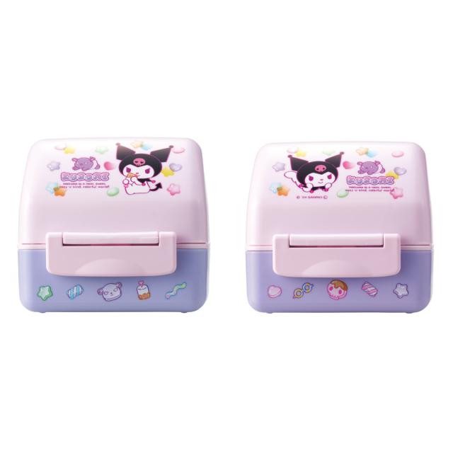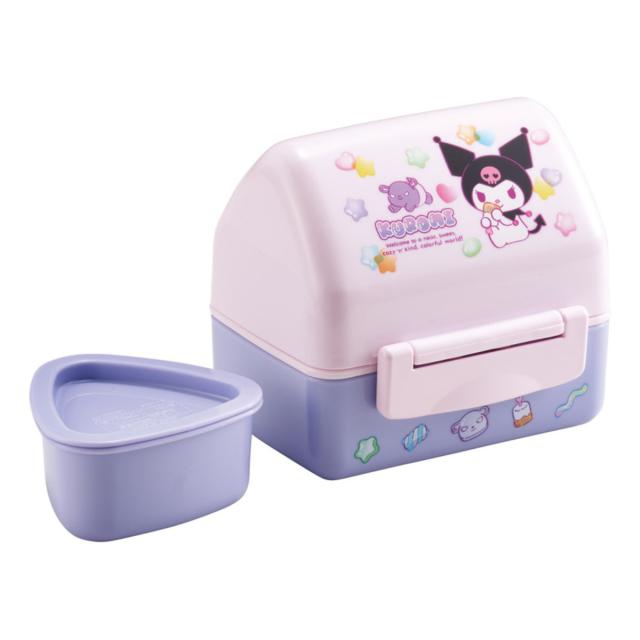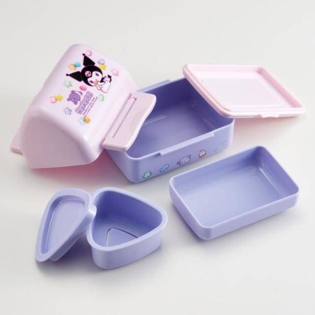 クロミの三角屋根のランチボックスです。付属の押し型で作った三角おにぎりを、中皿に3コ並べられます。下段には、おかずやふりかけなどを入れられます。おにぎりは食べやすいので、小さなお子様のお弁当やピクニックなどにおすすめです。