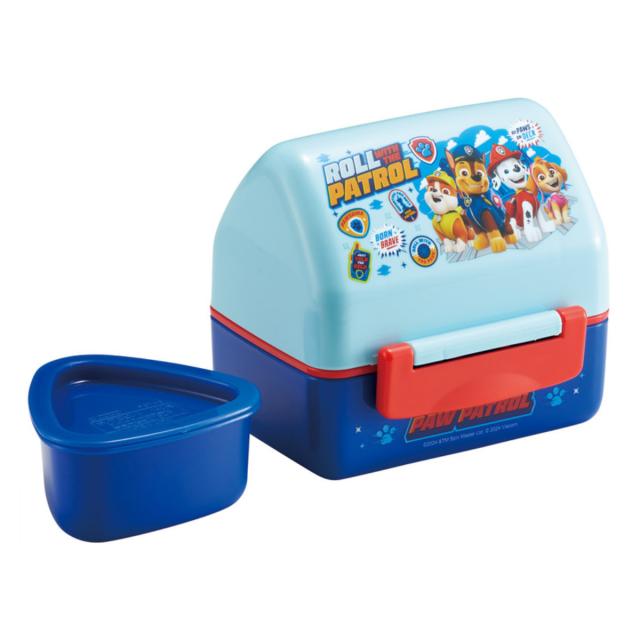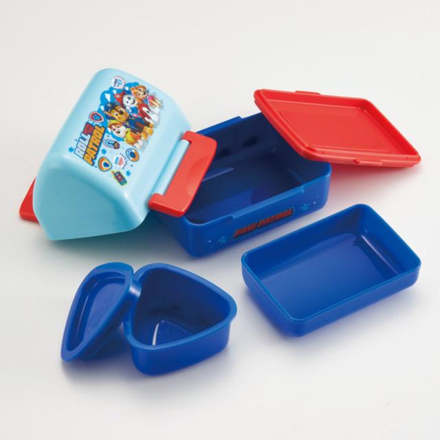 パウ・パトロールの三角屋根のランチボックスです。付属の押し型で作った三角おにぎりを、中皿に3コ並べられます。下段には、おかずやふりかけなどを入れられます。おにぎりは食べやすいので、小さなお子様のお弁当やピクニックなどにおすすめです。
