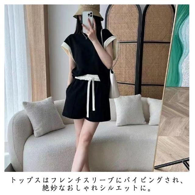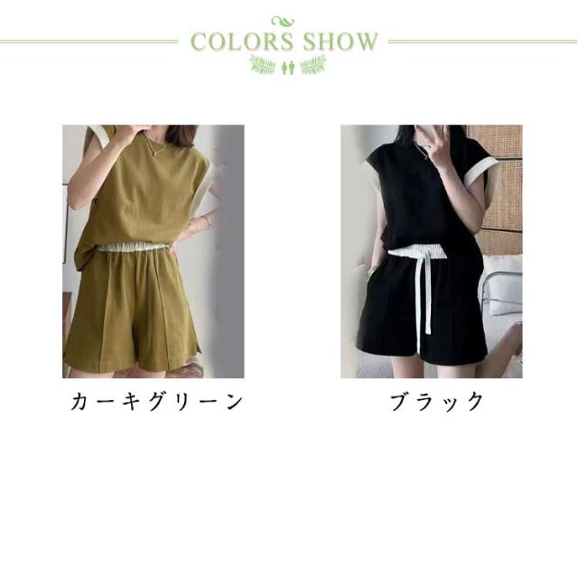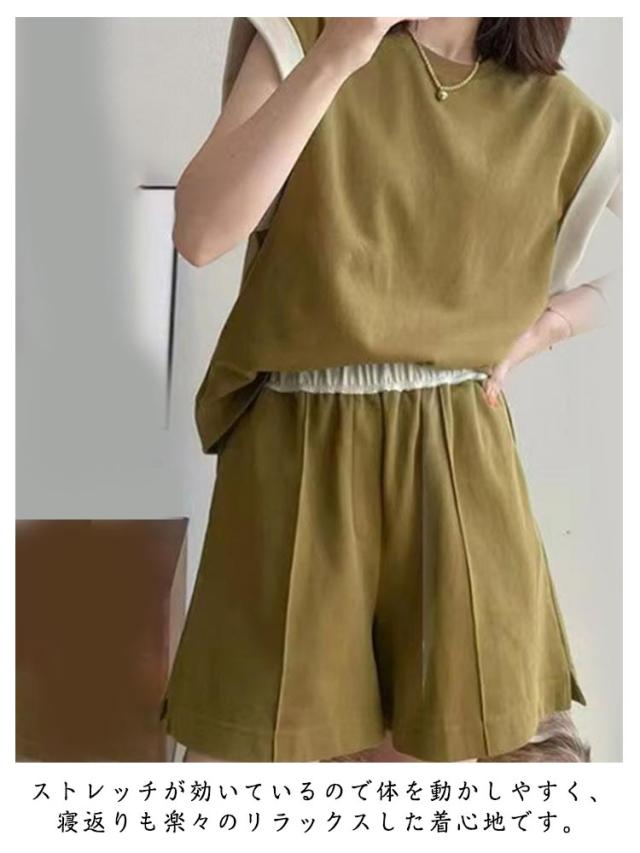 | 落ち感のある薄手素材がサラサラとした肌ざわりの大人かわいいリラックスウェア。 トップスはフレンチスリーブにパイピングされ、絶妙なおしゃれシルエットに。 脚が長く見えるハイウエストのショートパンツも嬉しいポイント。 ストレッチが効いているので体を動かしやすく、寝返りも楽々のリラックスした着心地です。 カラーはこっくりとした上品な色使いのブラック、カーキグリーンをご用意しました。 お部屋でリラックスするときのルームウェアや部屋着・パジャマとしてはもちろん、大人っぽいシンプルなデザインなので、お手持ちのお洋服とコーディネートを楽しむこともできちゃいます。 着ごこちの良い薄手の生地だから、春夏シーズンを涼しく快適に過ごせます。 | |