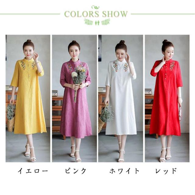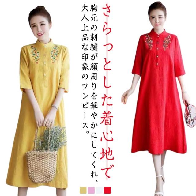 ワンピ レディース ミモレ丈 春 夏 エスニック 刺繍 シャツワンピース アジアン チュニック 無地 ワンピース ボリューム袖 花柄 ミディ丈 ワンピース ボヘミアン 民族 レトロ リゾート シャツワンピース ゆったり