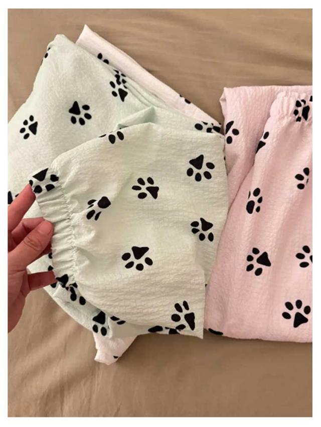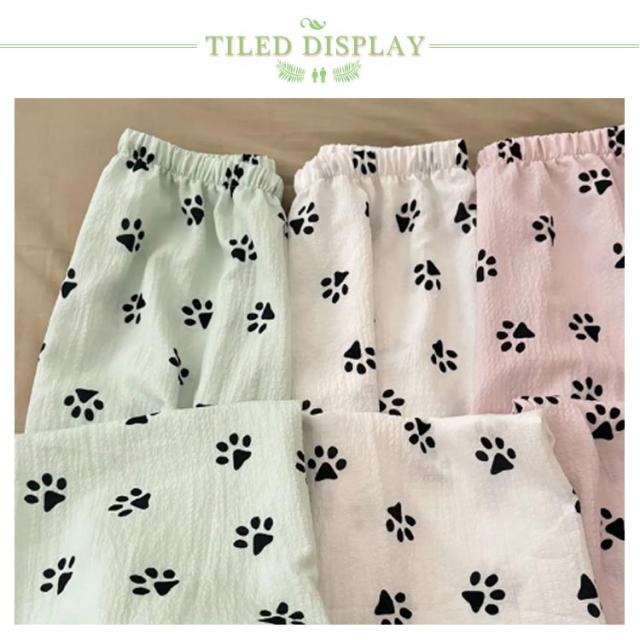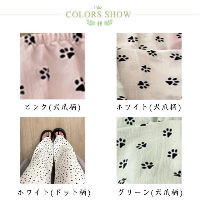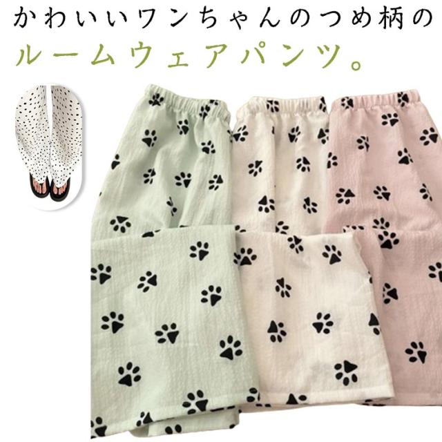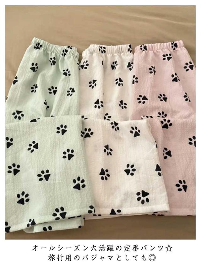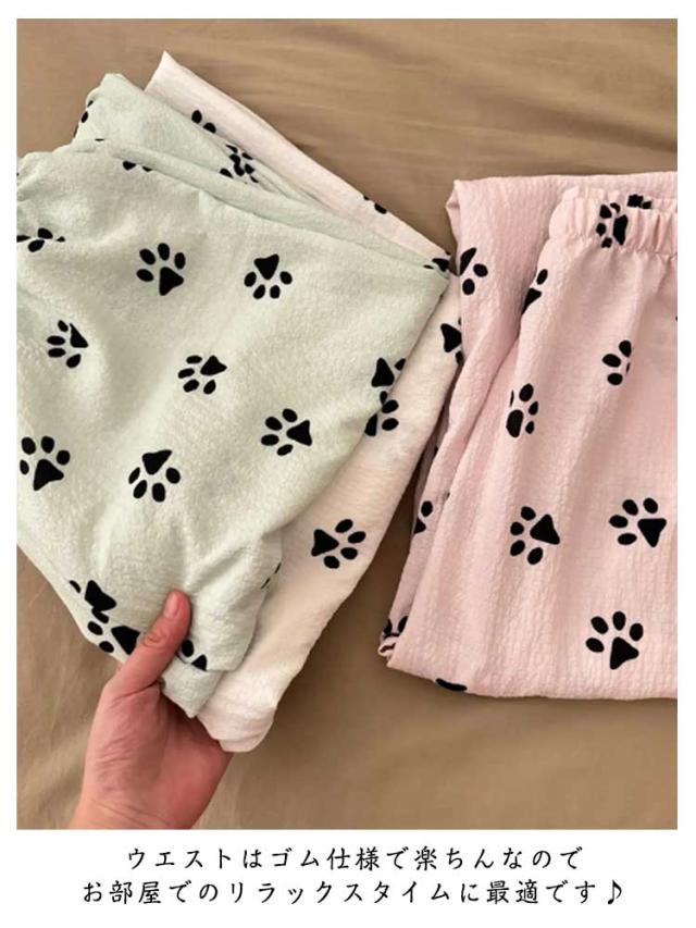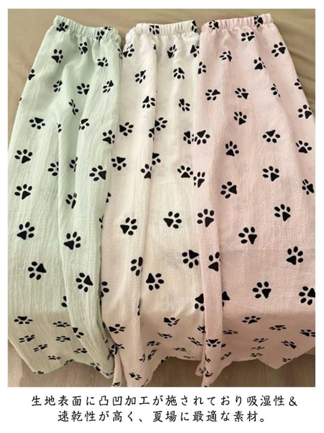 | かわいいワンちゃんのつめ柄のルームウェアパンツ。 生地表面に凸凹加工が施されており吸湿性&速乾性が高く、夏場に最適な素材。 ストレートなワイドシルエットだから窮屈感もありません。 ウエストはゴム仕様で楽ちんなのでお部屋でのリラックスタイムに最適です♪ オールシーズン大活躍の定番パンツ☆旅行用のパジャマとしても◎ | |