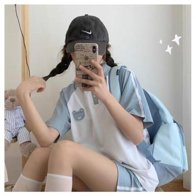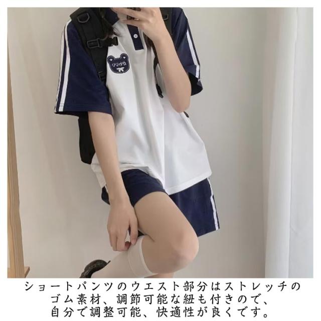 短パン サイドライン ポロシャツ ライン入り ショートパンツ 上下セット カットソー 半袖 ジャージ ポロシャツ ネイビー レディース スポーツウェア リラックス 体型カバー 部屋着 夏 春 スウェットパンツ ブルー ルームウェア