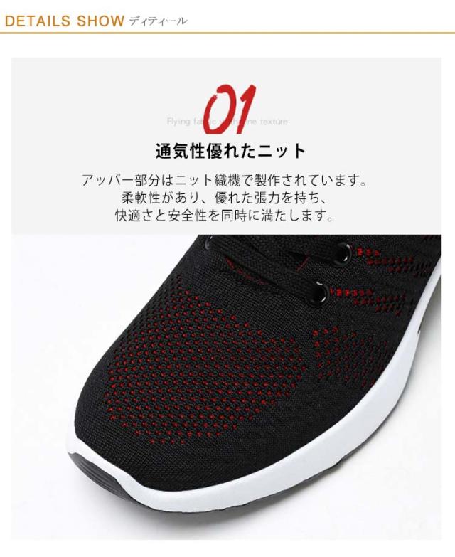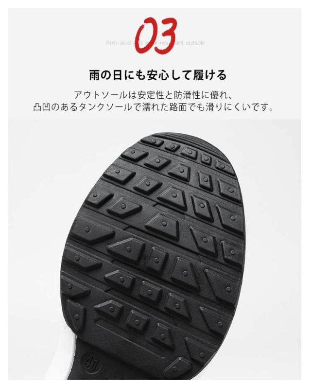 | 24.5-27.5cm 高通気性で夏でも快適に 軽量・柔軟 スニーカー <お勧めポイント> 1.通気性優れたニット アッパー部分はニット織機で製作されています。柔軟性があり、優れた張力を持ち、快適さと安全性を同時に満たします。 2.足にしっくり馴染む 柔らか素材で足に負担がかかりにくく、履き口は伸縮性のあるので脱着しやすいのでサッと履けて出かけられます。 3.雨の日にも安心して履ける アウトソールは安定性と防滑性に優れ、凸凹のあるタンクソールで濡れた路面でも滑りにくいです。 4.存在感抜群の厚底ソール 弾力性・反発性に優れ、歩行やジャンプの衝撃をしっかり吸収。 5.通勤通学、普段のお出かけやお散歩、ショッピングや旅行と、あらゆるシーンで活躍します。 6.スッキリしたスタイリッシュなデザインなので様々なコーデに取り入れやすいです。 | |