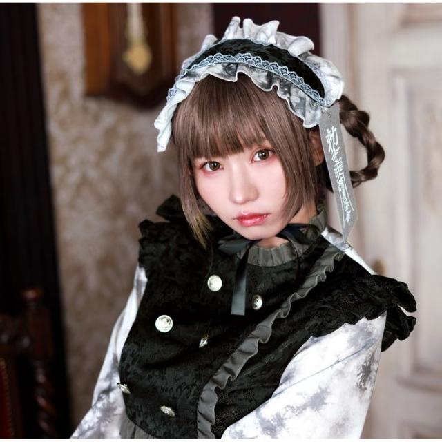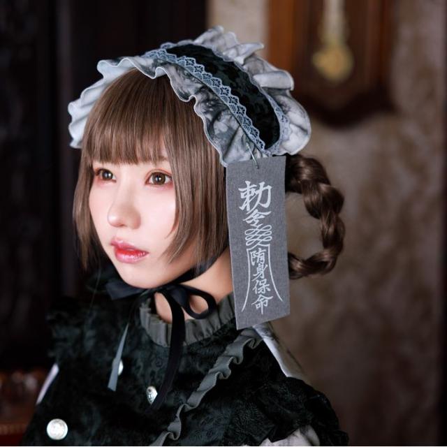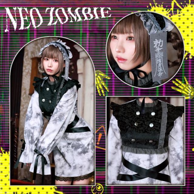 ゾンビの多様性にフィーチャーした王道かつ斬新なシリーズ、ネオゾンビ。ゴシック×キョンシー×ゾンビをテーマにした新しいデザインです。定番のキョンシーとは違い、ヘッドドレスにしたことで、ゴシックドールをイメージしました。ヘッドドレスは顎下でリボンを結ぶタイプですが、クリップピンもついており、髪に固定することが出来ます。お札はピンで留めるタイプなので、好きな場所に付けることが出来ます。上半身には凹凸感のあるチャイナ生地を使用し、豪華な作りになっています。リボン付きのキョンシーらしさ満載の長めの袖がポイントです。全体にオリジナルの汚れプリント生地を使用し、ゾンビ感を演出しました。
