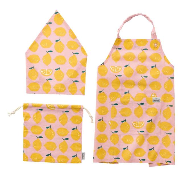 幼稚園〜小学校中学年(身長100〜130cm)のお子様向けのエプロン・バンダナ・巾着の3点セットです。可愛らしいレモンの総柄デザインです。良質なインド綿でしっかりと織られた生地なので丈夫です。持ち運びに便利な巾着付きで家庭科の授業にもおすすめです。