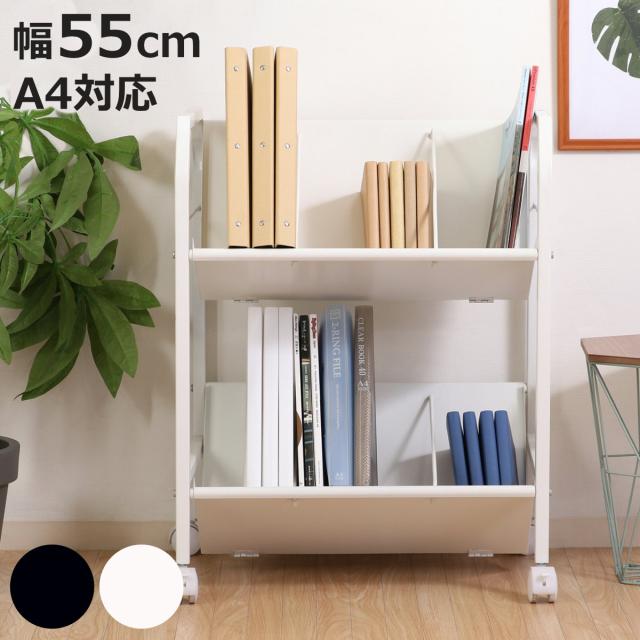 ファイルワゴン 幅55cm 2段 キャスター付 ( ワゴン A4対応 書類 ファイル 収納 ブックエンド付 ファイルラック 棚 ラック 斜め 本棚 机下 ブラック ホワイトA4 )