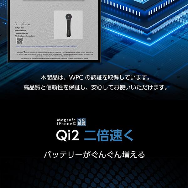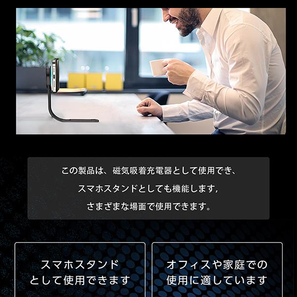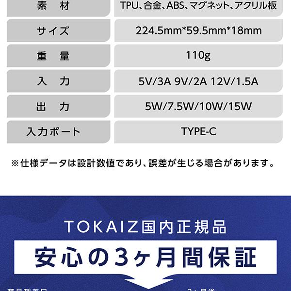| 商品詳細 | 素材:TPU、合金、ABS、マグネット、シリコン サイズ:224.5mm×59.5mm×18mm 重量:110g 入力:5V/3A、9V/2A、12V/1.5A 出力:5W、7.5W、10W、15W 充電通信有効距離:8mm 入力ポート:Type-C ※使用データは設計数宇であり、誤差が生じる場合があります。 |