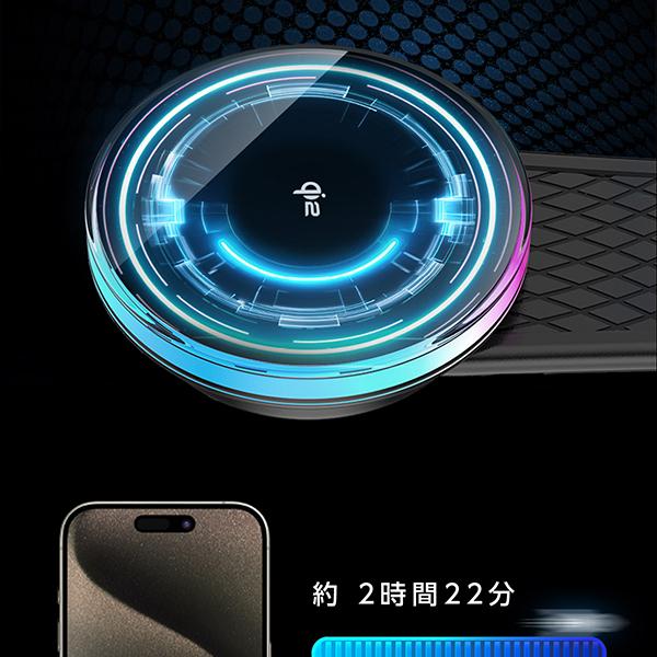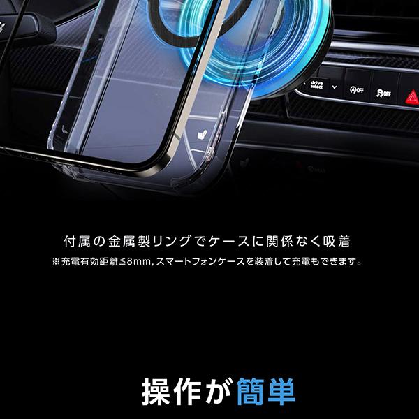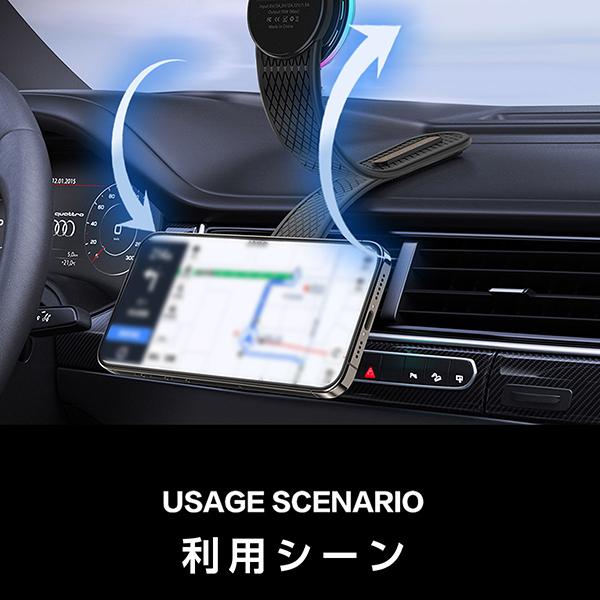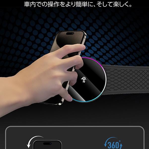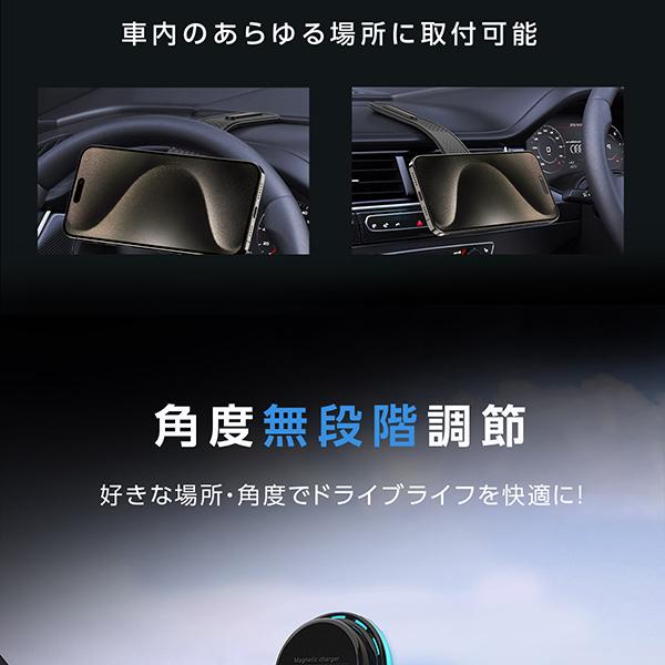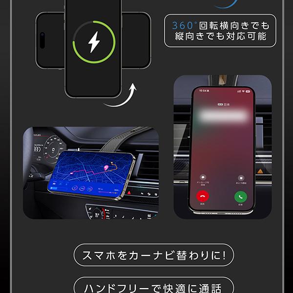 15W急速充電&52N超強力磁石でスマホを安定保持。片手操作で地図確認も簡単、場所を選ばず設置可能&角度自由調節でドライブを快適に。