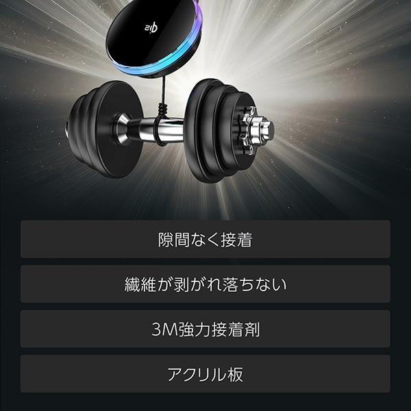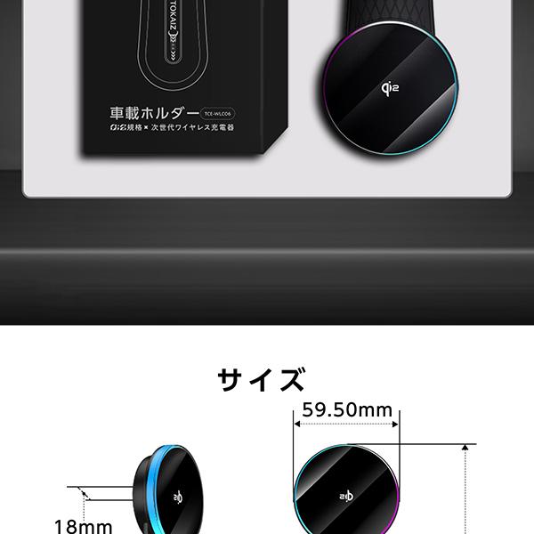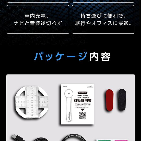 | 同梱品 | 車載ホルダーワイヤレス充電器×1 メタルリング×1 充電ケーブル×1 マジック3Mテープ×1 位置合わせシート×1 アルコールシート×1 取扱説明書×1 |