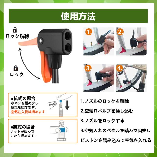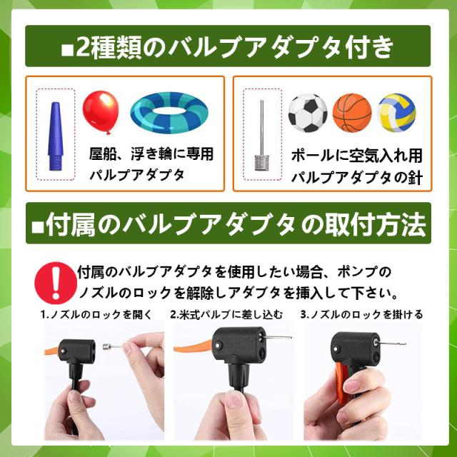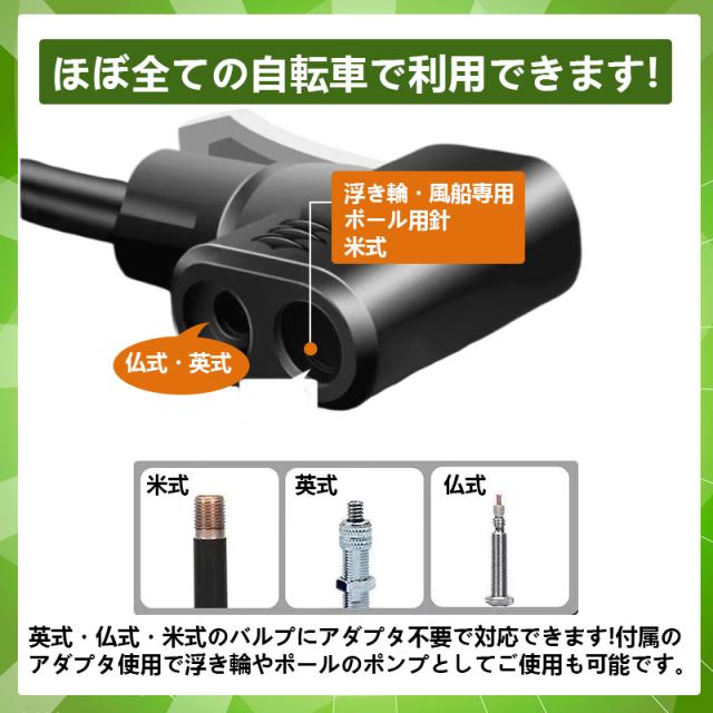 英・仏・米式のバルブにアダプタ不要で対応できます!付属のアダプタ使用で浮き輪やボールのポンプとしてご使用も可能です。