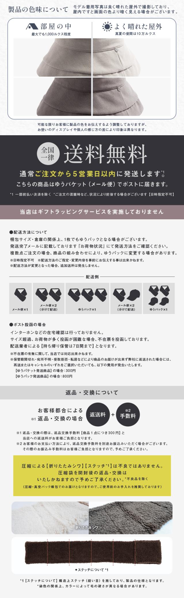 | ・お取り扱いの前に品質表示タグの記載内容をご確認ください。 ・商品単体の画像が実際の商品に近い色味ですのでご参照ください。 ・素材の性質上、匂いが強いものがございます。気になる場合は、風通しの良いところで陰干しをする事により匂いは軽減されます。 ・お客様の送料負担を軽減させるため、圧縮した状態でメール便にてお届けします。長時間圧縮した状態で放置しますと畳みシワの原因となりますので、お早めに開封し、陰干しすることをおすすめします。 ・同一カラーでも、染色過程で色味が多少変わる場合があります。 ・ご覧頂くモニターの発色具合によって実物と色が異なって見える場合があります。 ・圧縮袋開封後の返品・交換はいたしかねます。(不良品を除く) |