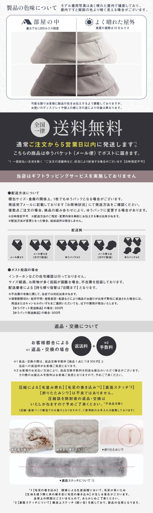 | ・素材の特性上、型崩れや縮みの原因になりますので、洗濯はお避けください。 ・濃色品は汗や雨・摩擦により色落ちすることがありますのでご注意ください。 ・素材の特性上、毛羽が他の物に付着する場合があります。 ・本製品は、留め具部分に磁石を使用しています。医療機器(心臓ペースメーカー等)を装着している方は、ご使用をお避けください。 ・電子機器の近くでご使用されますと破損及び故障の恐れがございますのでご注意ください。 |