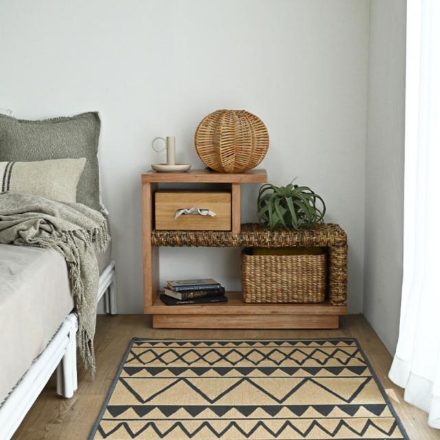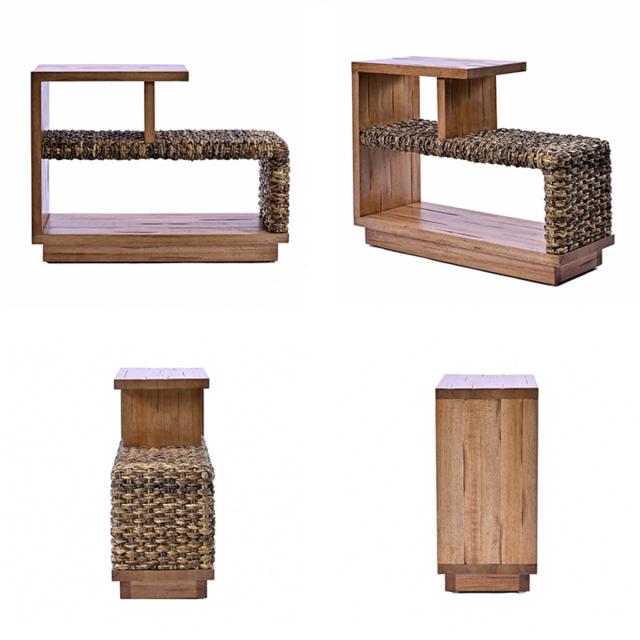 野性味溢れる質感が特徴のバナナリーフと、製材の加工跡をあえて残したアメ色のアルバシアでできたサイドテーブルです。ざっくりとした素材感とハンドメイド仕上げで温かみのある風合いは、落ち着きのあるラフでレトロな空間を演出します。