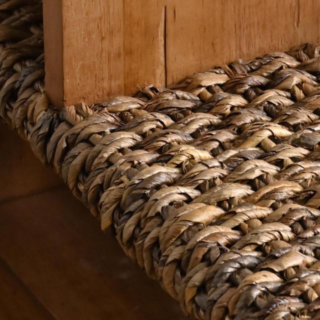 自然な濃淡が特徴的なバナナリーフは、3年ほどで材料となる収穫ができるエコな素材。バナナの葉には冷却効果や抗菌作用があるとされており、食品を包む食器や資材としても利用されています。太陽光や雨風に強いバナナの葉をアメ色にいぶし、乾燥させ、細かく撚ったものを編み上げて家具に使用しています。