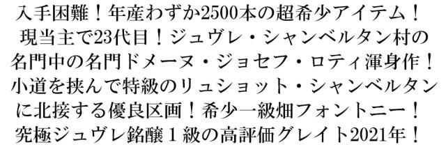 入手困難!年産わずか2500本の超希少アイテム! 現当主で23代目!ジュヴレ・シャンベルタン村の 名門中の名門ドメーヌ・ジョセフ・ロティ渾身作! 小道を挟んで特級のリュショット・シャンベルタン に北接する優良区画!希少一級畑フォントニー! 究極ジュヴレ銘醸1級の高評価グレイト2021年!