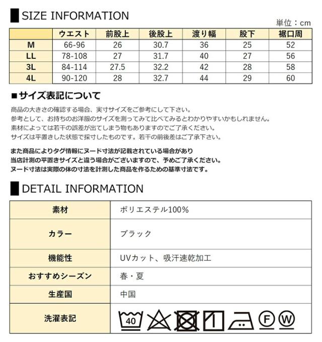 3L:ウエスト84-114 前股上27.5 後股上32.2 渡り幅42 股下28 裾口周58