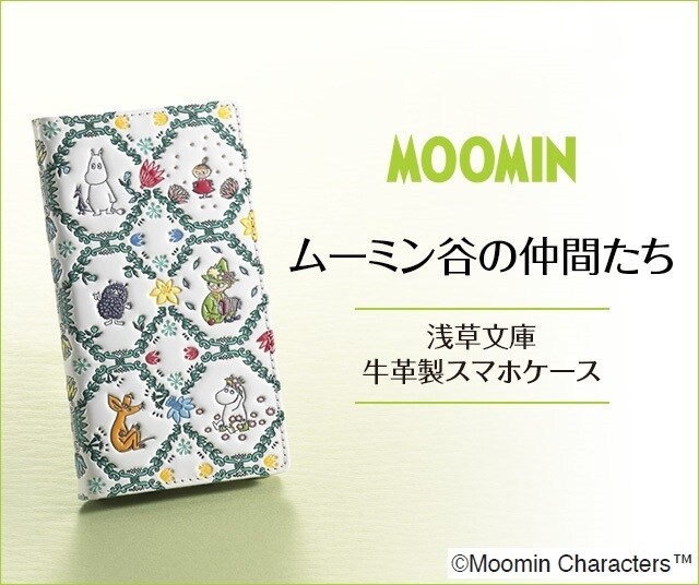 浅草文庫とは、播州姫路伝統の白くなめした牛革に友禅染の手法で色鮮やかな柄をあしらい、型押しでふっくらとした質感に仕上げた“革と色彩の芸術品”。革の選定をはじめ、摺り、型押し、手彩色といった、いくつもの複雑な工程が熟練職人の手作業で行われます。 日本の伝統とおしゃれな北欧のテイストが融合した本商品には、『ムーミン』に登場する12のキャラクターが大集合! 愛すべきムーミン谷の仲間たちが、高度な型友禅や手描き友禅の技法で、13もの色を重ねてカラフルに表現されました。さらに立体的な型押しによって、ムーミンたちや北欧の草花模様が量感豊かに浮かび上がる様子は、見ているだけで心が躍ります。 もちろん、毎日使うスマホケースだから、機能性も忘れていません。大事なスマホをぴったり固定できる安心の粘着シリコン仕様で、便利なポケット付きなので使いやすさにも自信あり。