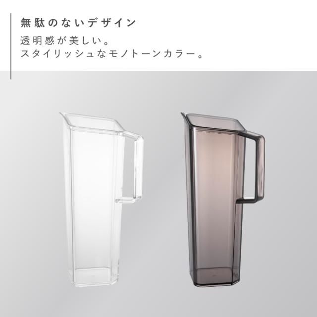 透明度が高く美しい佇まいで涼しげな冷水筒。冷蔵庫のドアポケットにもすっきり収まるスリムな設計。