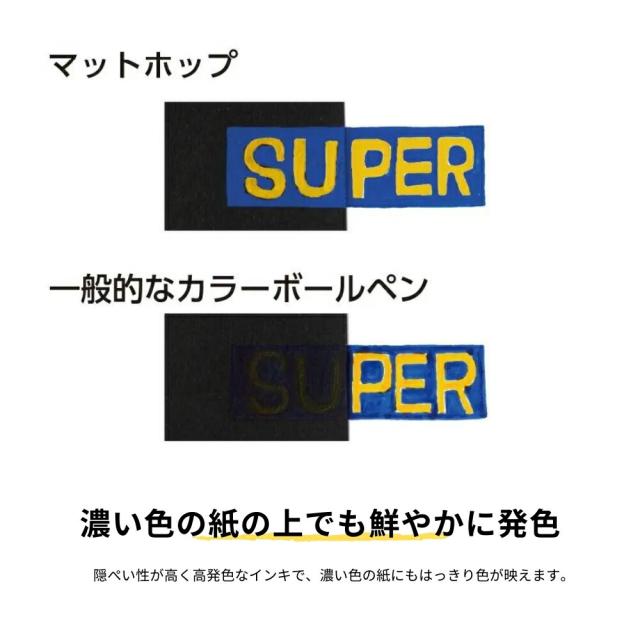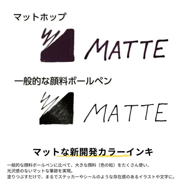 一般的な顔料ボールペンに比べて、大きな顔料(色の粒)をたくさん使い、光沢感のないマットな筆跡を実現。