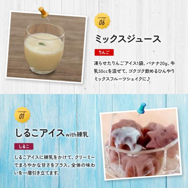 常温保管時はアレンジしやすい液体のため、凍らせるだけでなく、ドリンクとしてもお楽しみいただけます♪凍らせても袋ごとモミモミすれば、牛乳などとも混ぜやすくなり、シェイク風のドリンクも作れます。様々なアレンジレシピでお楽しみください!