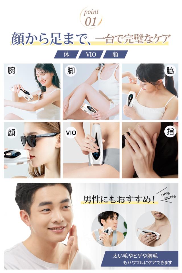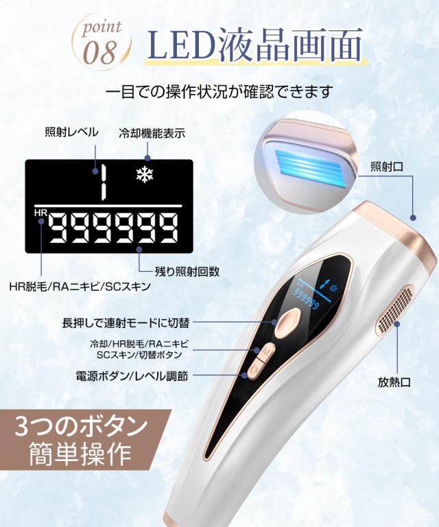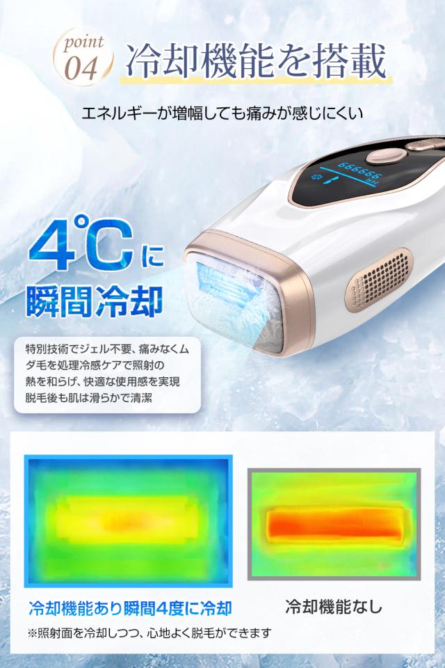 冷感脱機能付き、急速に皮膚温度を下げ、アレルギー、赤く腫れる副作用を防止します。男性でも女性でもっ使用できます。サロン級の安全性で、メンズ レディースに向き、安心にご利用いただけます。