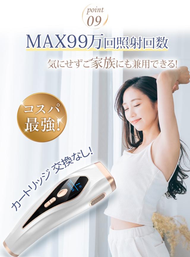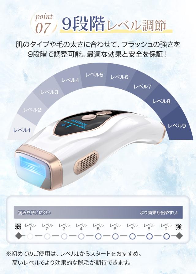 99万発のフラッシュ回数が搭載されています。使用部位や肌質によって、照射レベルが1~9調整できるので、ムダ毛ケア効率がアップ!そして、操作方法は簡単安全で肌にしっかりと接触していないと作動しない安全機能を搭載しています。