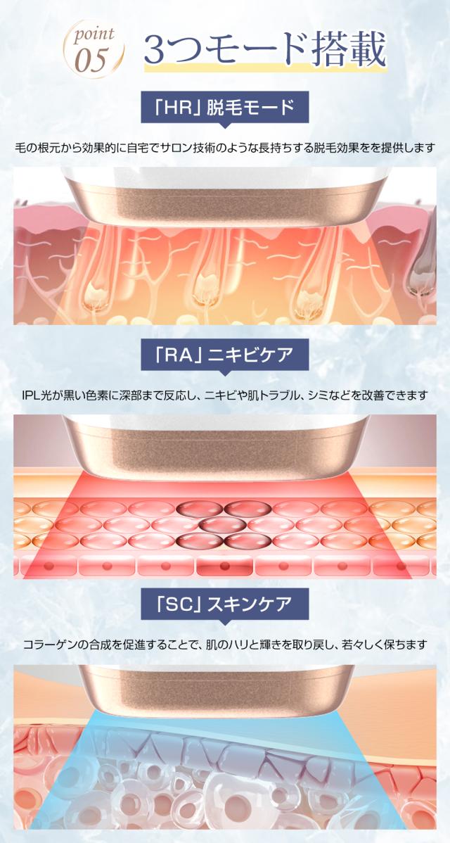 ●モード:HR(ムダ毛ケア用)、SC(スキンケア用)、RA(美肌モード)